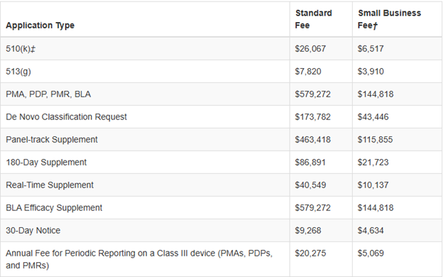 The following table shows the fees per each medical device submission type for FDA fiscal year 2026, beginning Oct 1, 2025 through September 30, 2026